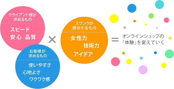 私たちは、プロモーション系のサイト制作会社スワンクでECサイトに特化したサービスの提供を目的として事業部を起こしました。たまたま女性ばかりの部署となりましたが、ECサイトの経験を積んでいくうちにお客様に「女性の気持ちがわかるので安心できる」、「女性が好みそうなデザインを作ってくれる」、「女性の立場で提案してくれる」など高い評価をいただけるようになりました。